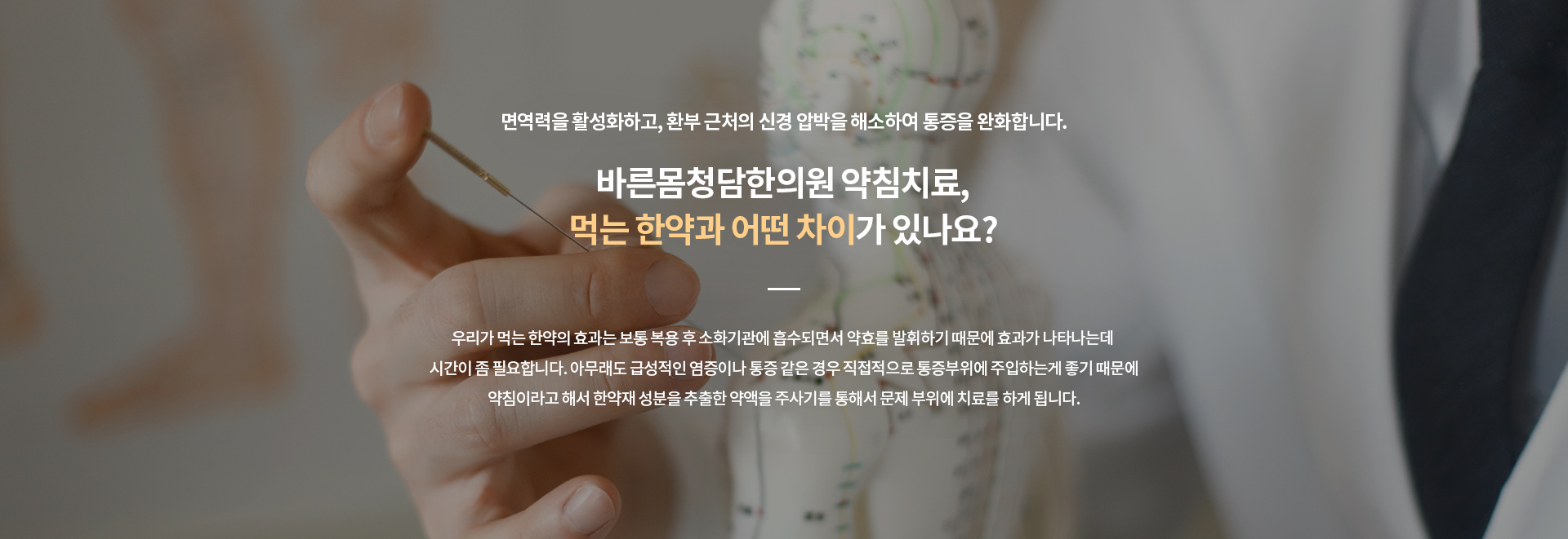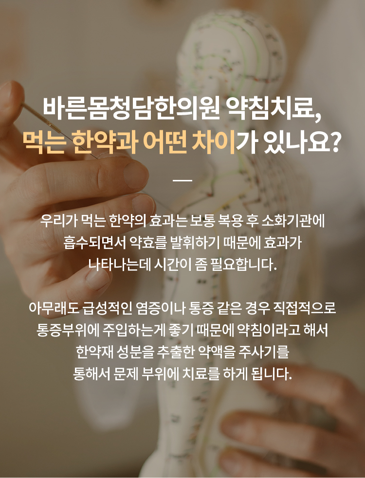 ħÀº ´ëÇ¥ÀûÀÎ ÅëÁõ Ä¡·á¹ýÀÔ´Ï´Ù. ÀϹÝħ ¿Ü¿¡µµ ¹ú¿¡¼ ÃßÃâÇÑ ºÀµ¶À» ÀÎü¿¡ ¹«ÇØÇÏ°Ô Á¤Á¦ÇÑ ºÀħ°ú ¼ø¼ö ÇѾàÀ縦 ¿øÀç·á·Î Á¶Á¦ÇÑ ¾àħÀ» Ç㸮ÁÖº¯ÀÇ ÅëÁõ ºÎÀ§¿¡ Á÷Á¢ ÁÖÀÔÇÏ°Ô µÇ¸é ÅëÁõ °¨¼Ò´Â ¹°·ÐÀÌ°í ¸é¿ª ÀÛ¿ëÀ» °È½ÃÄÑ Ä¡·á È¿°ú¸¦ ³ôÀÔ´Ï´Ù. ƯÈ÷ Ç㸮µð½ºÅ©(Ãß°£ÆÇÅ»ÃâÁõ)·Î ÀÎÇÑ ¿°Áõ Á¦°Å¿¡ È¿°ú°¡ ÀÖ¾î ºü¸£°Ô ÅëÁõÀ» Ä¡·áÇÕ´Ï´Ù.