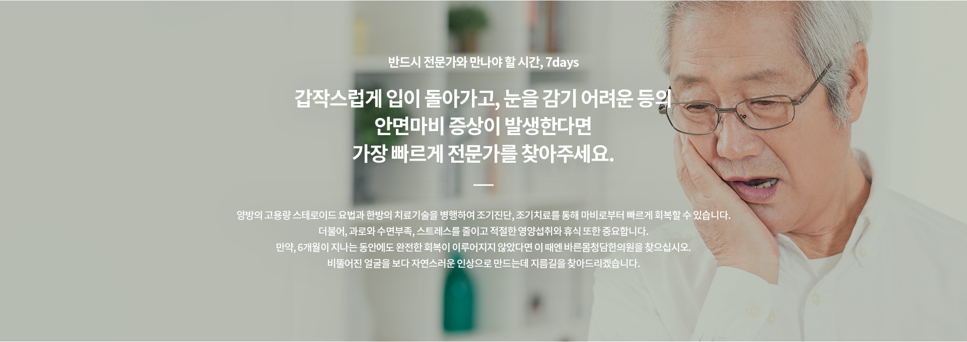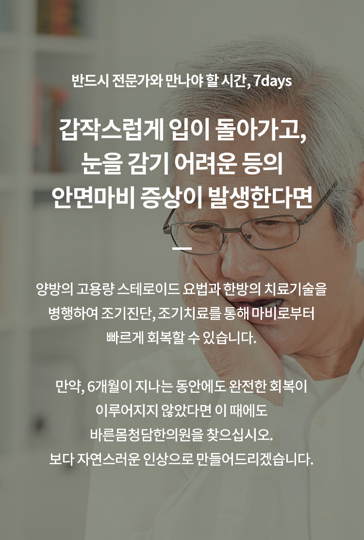 ¾È¸é¸¶ºñ´Â ³ú½Å°æÀ» ±¸¼ºÇÏ´Â 12°³ÀÇ ½Å°æ Áß 7¹øÂ°ÀÇ ½Å°æÀÎ ¾È¸é½Å°æÀÌ ¾î¶°ÇÑ ¿øÀÎÀ¸·Î ±â´ÉÀ» ÀÒ°Ô µÊÀ¸·Î½á ÀÌ ½Å°æÀÌ Áö¹èÇÏ´Â ¾È¸éºÎÀÇ ±ÙÀ°ÀÌ ¿øÈ°ÇÏ°Ô ¿òÁ÷ÀÌÁö ¾Ê°Ô µÇ¾î, ÇÑÂÊÀ¸·Î ´«°ú ÀÔ¼úÀ» ºñ·ÔÇÑ ¾ó±¼ÀÇ ¸ð¾çÀÌ ºñ¶Ô¾îÁö°Ô µÇ´Â ÁúȯÀÔ´Ï´Ù. ÈçÈ÷ ±¸¾È¿Í»ç, º§¸¶ºñ, ¾È¸é½Å°æ ¸¶ºñ·Î ºÒ¸®±âµµ ÇÕ´Ï´Ù.