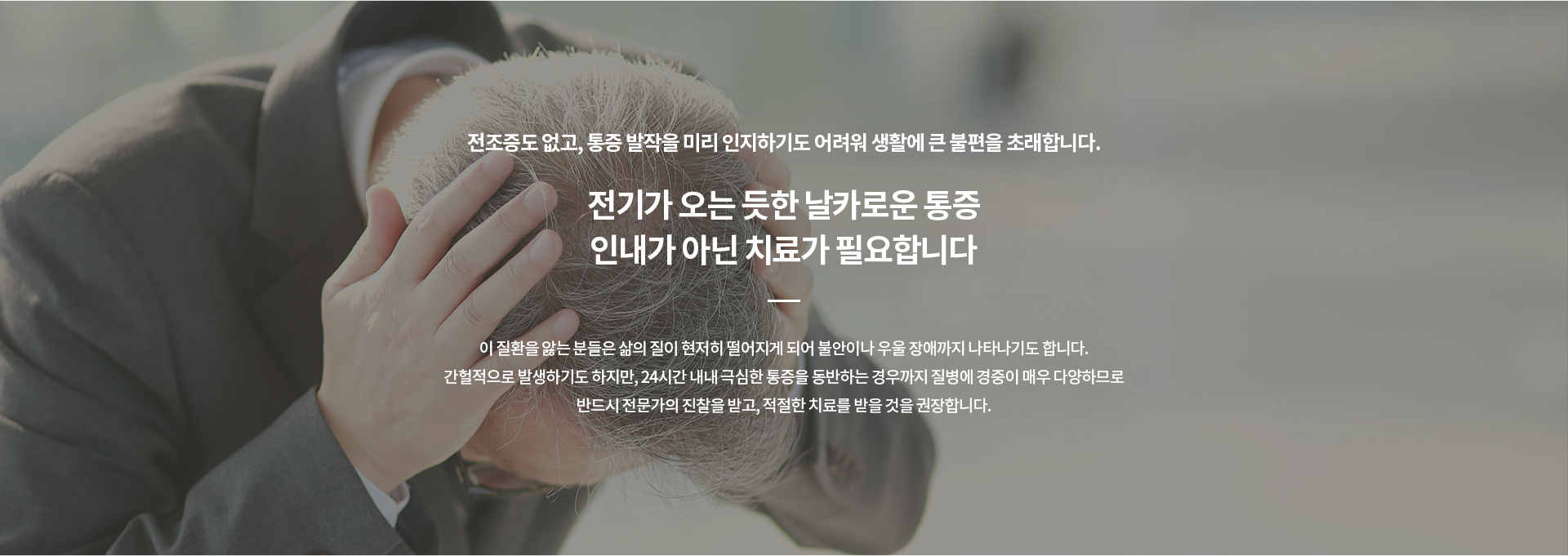 »ïÂ÷½Å°æÅëÀ̶õ ¾ó±¼ÀÇ °¨°¢À» ´ã´çÇÏ´Â ³ú ½Å°æÀÎ »ïÂ÷½Å°æÀÇ ÀÌ»óÀ¸·Î ÀÎÇØ¼ ¾ó±¼ ÇÑÂÊ¿¡ Ä®·Î µµ·Á ³»´Â µíÇÑ ÅëÁõÀ̳ª Àü±â °¨ÀüÀ¸·Î ÀÎÇÑ ÅëÁõ°ú °°Àº ¹ßÀÛÀûÀÎ ÅëÁõÀÌ ¼ø°£ÀûÀ¸·Î ³ªÅ¸³ª´Â Áúº´À» ¸»ÇÕ´Ï´Ù. Á¤È®ÇÑ ¹®ÁøÀ¸·Î »ïÂ÷½Å°æÅëÀÇ Æ¯Â¡ÀûÀÎ Áõ»óÀ» º¸°í Áø´ÜÇÏ°Ô µÇ´Âµ¥ ¼öÃʰ£ ¾È¸éºÎÀ§¿¡ °£ÇæÀûÀ¸·Î ¹ßÀÛÀûÀÎ ÅëÁõÀÌ ¹ß»ýÇß´Ù°¡ »ç¶óÁö´Â Áõ»óÀÌ ¹Ýº¹µÇ¸é »ïÂ÷½Å°æÅëÀÏ °¡´É¼ºÀÌ ¸Å¿ì ³ô½À´Ï´Ù.